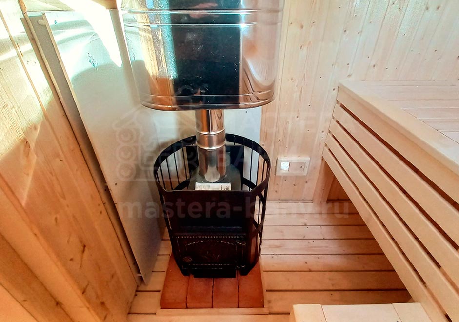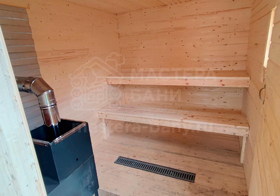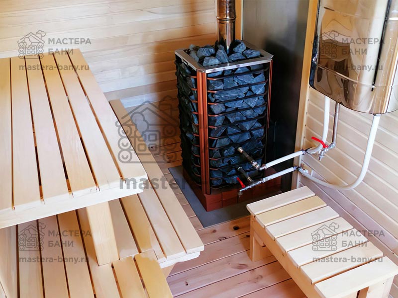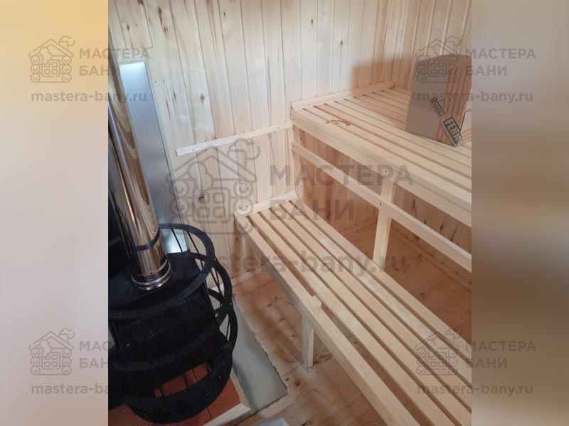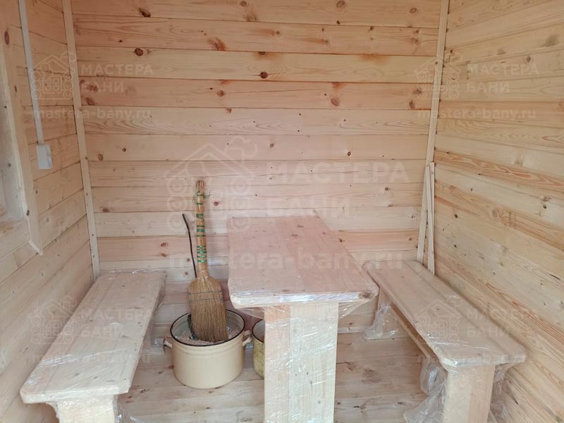печь, камни, бак для нагрева воды, полки, стол и лавочки. Вам нужно только ее затопить.