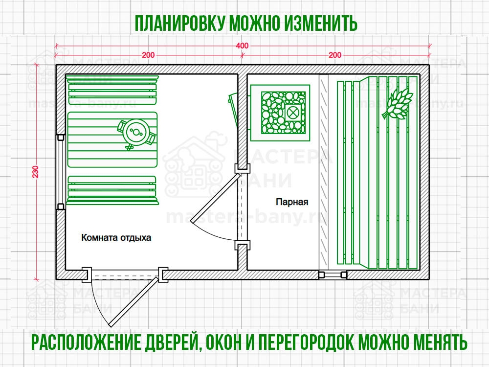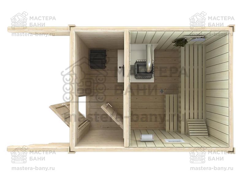Помещений: 2 (парная, комната отдыха), можно добавить моечную