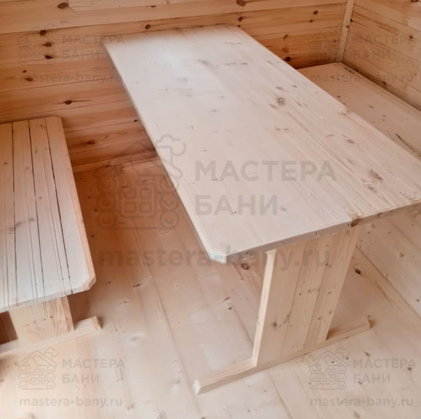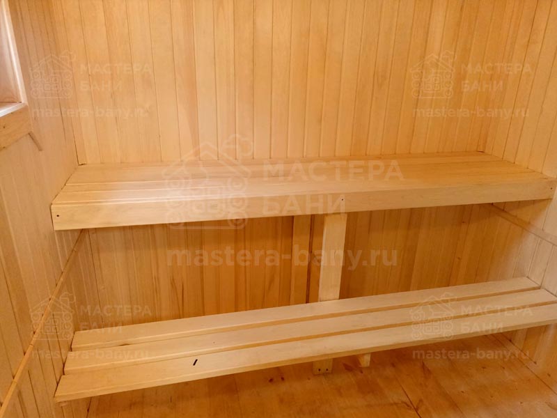 печь, камни, бак для нагрева воды, полки, стол и лавочки. Вам нужно только ее затопить.