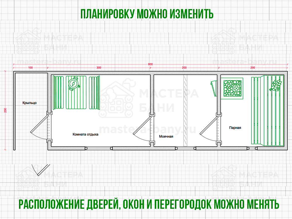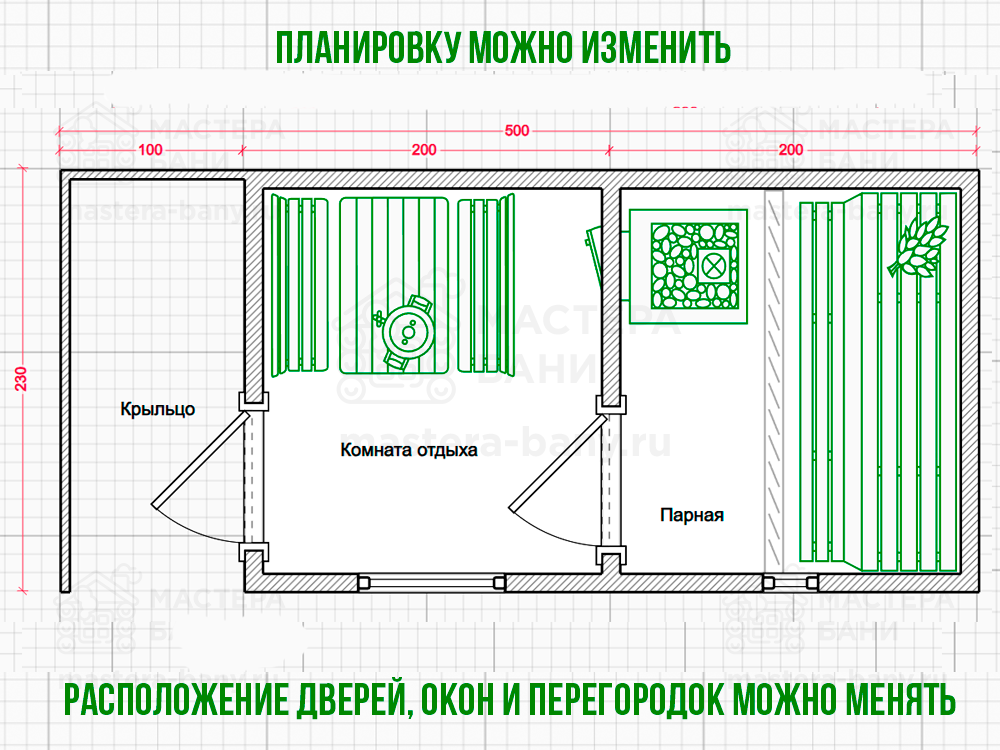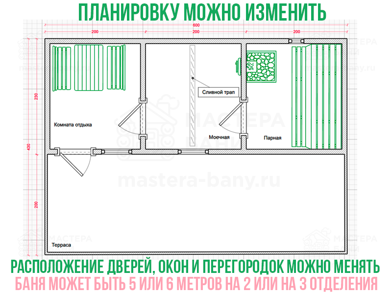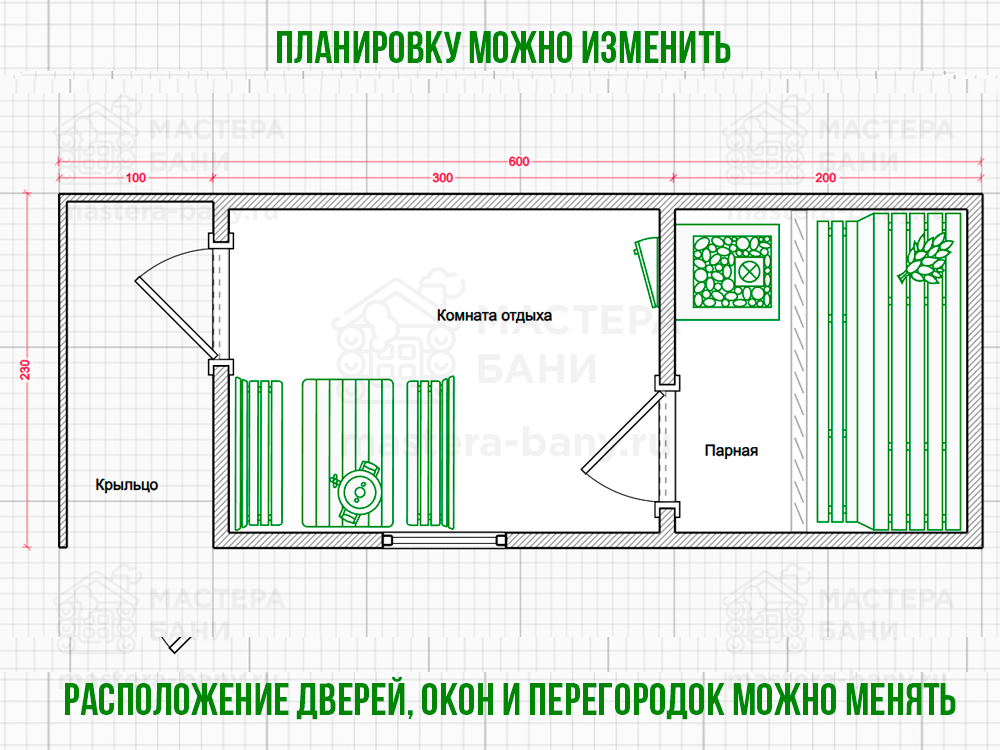 Возможны любые изменения в любом проекте, который размещен на сайте. Также вы можете прислать нам ваш план или проект. Любую баню можно сделать из бруса или по каркасной технологии.